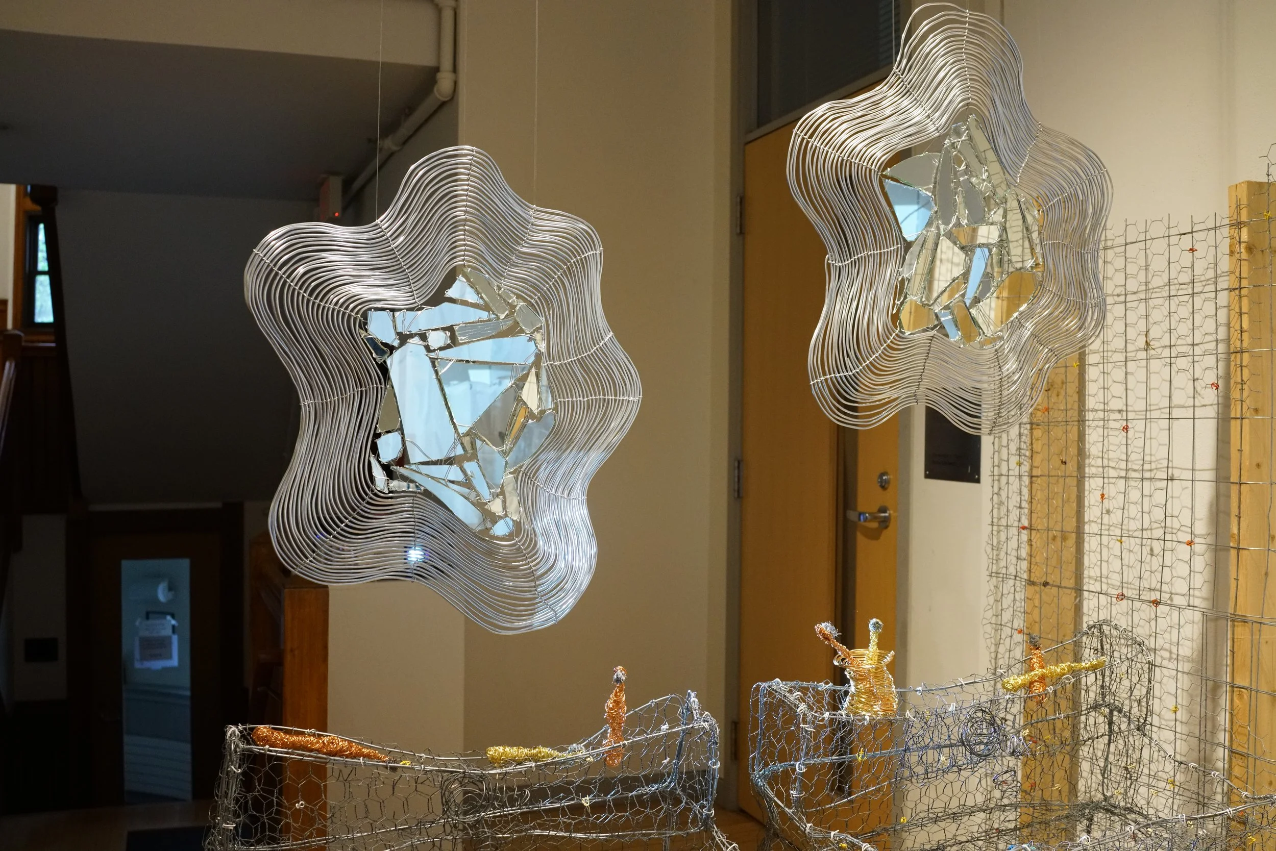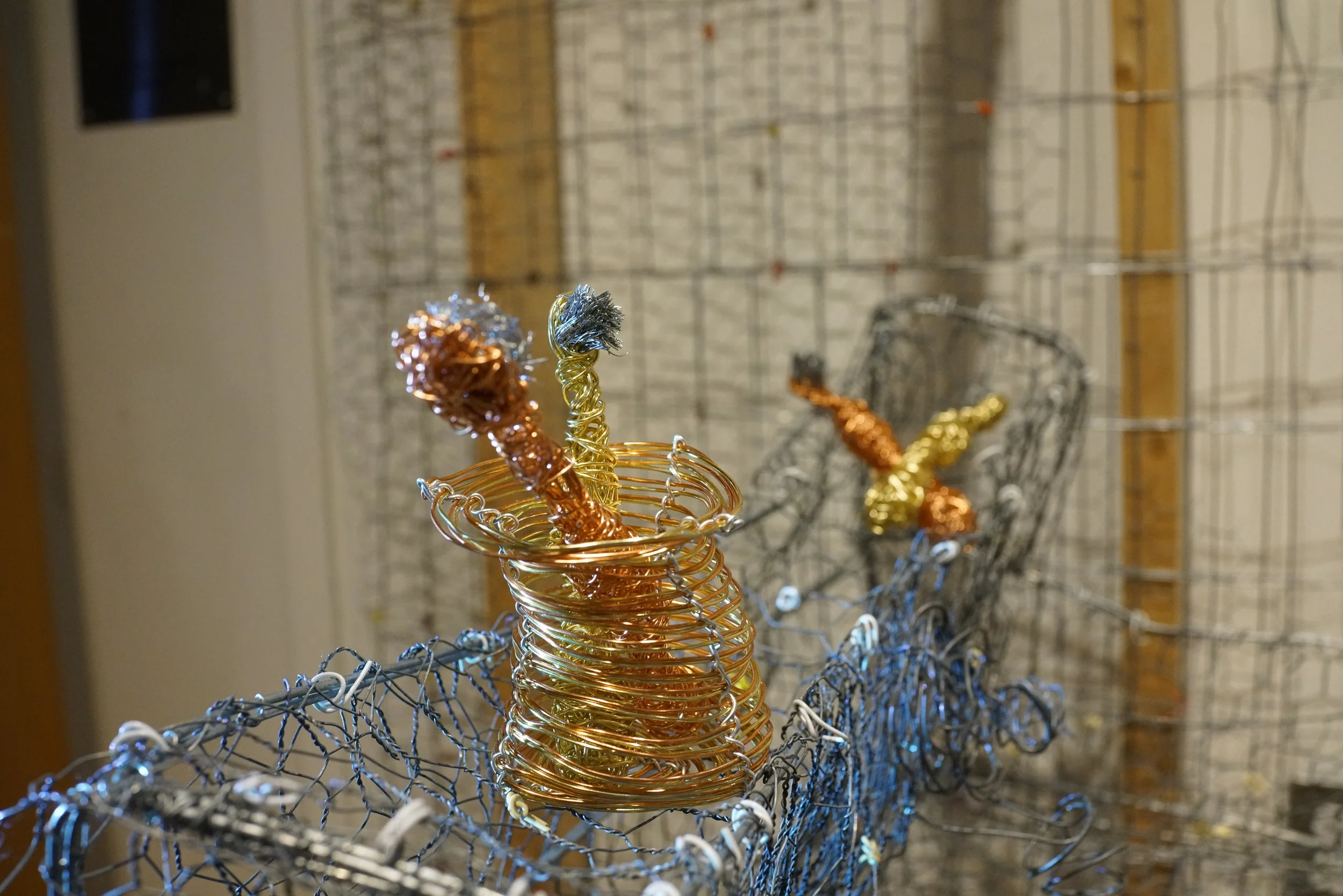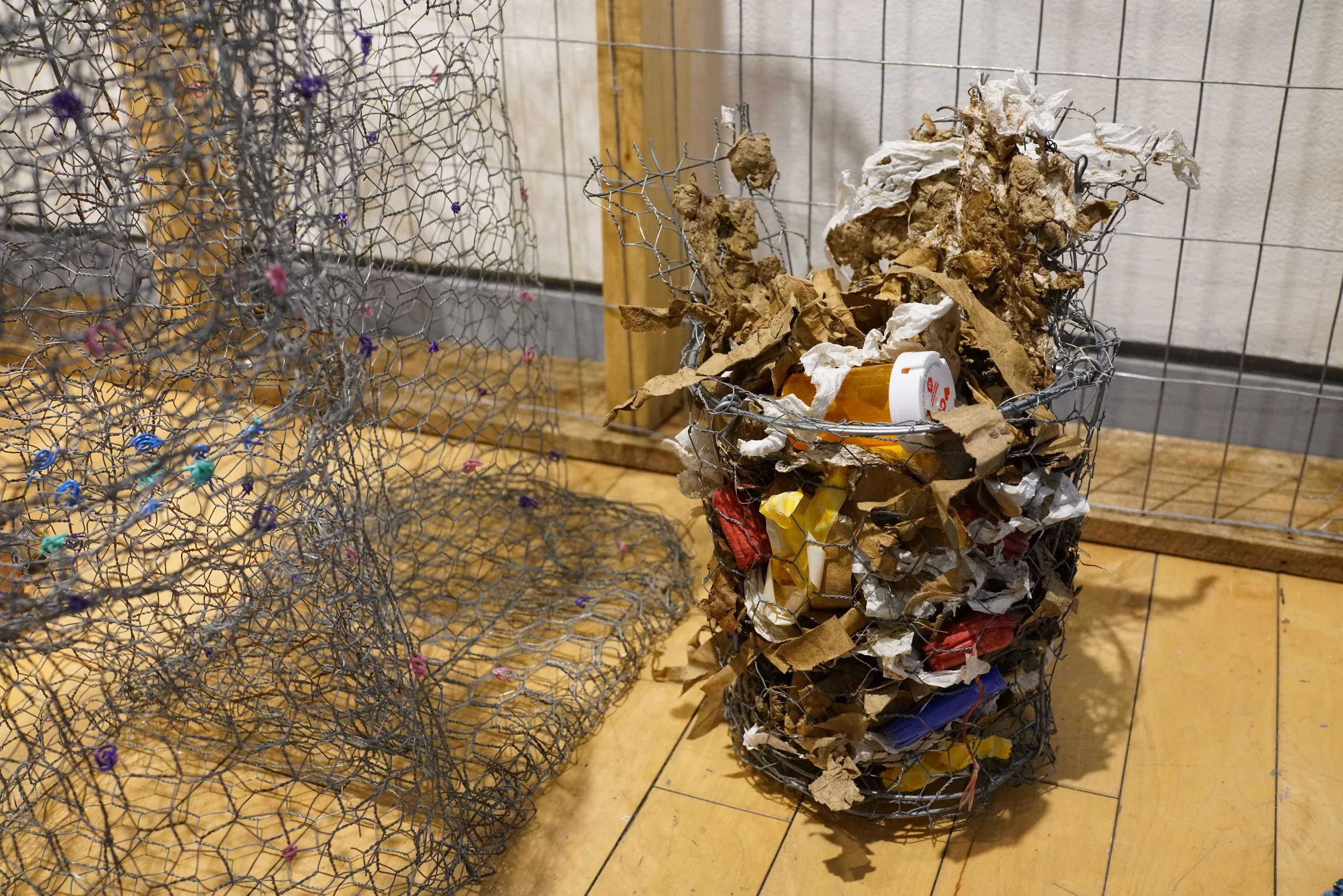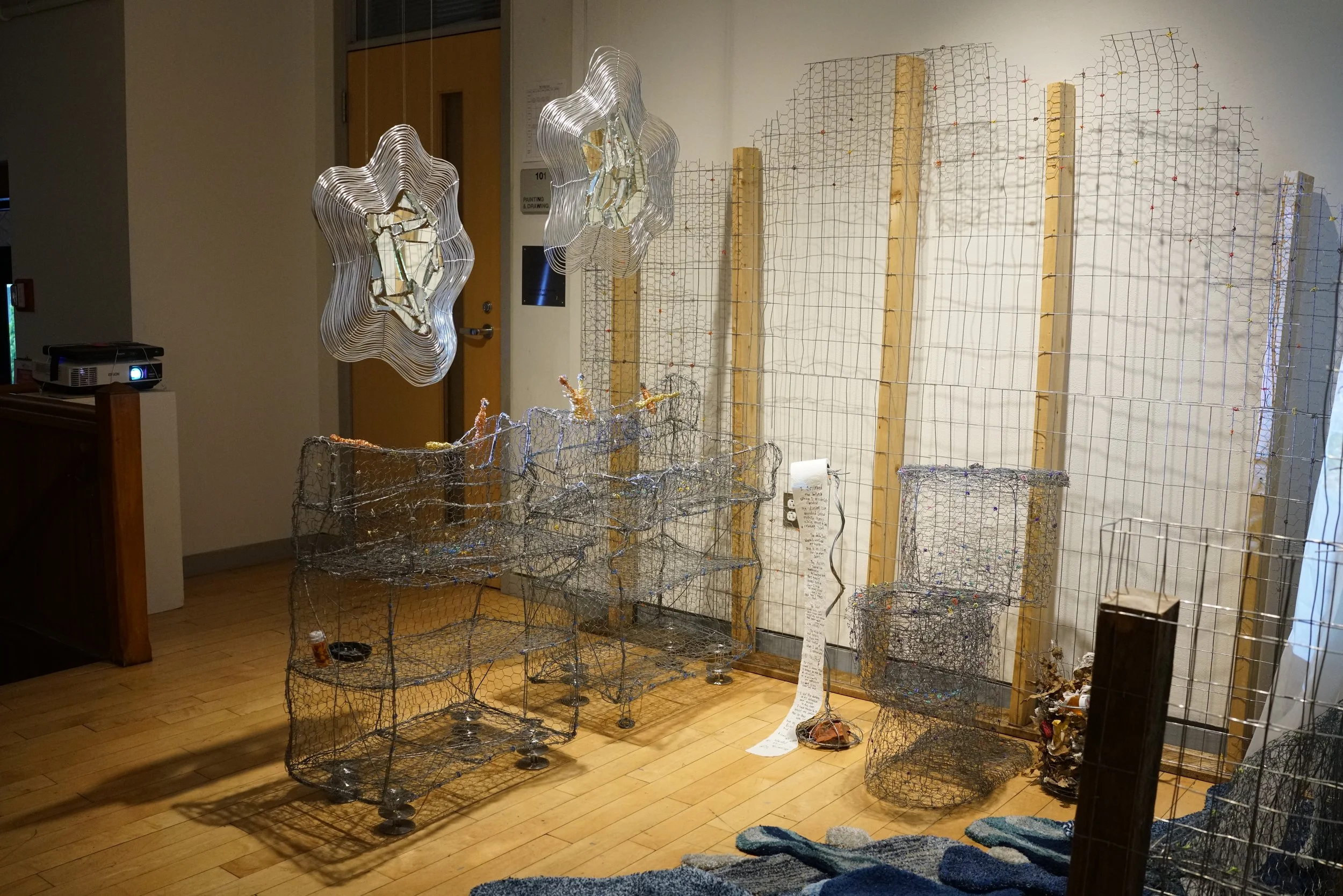 chicken wire, fence wire, aluminum wire, steel wire, fiber, film reels, ceramics, found objects, film projection