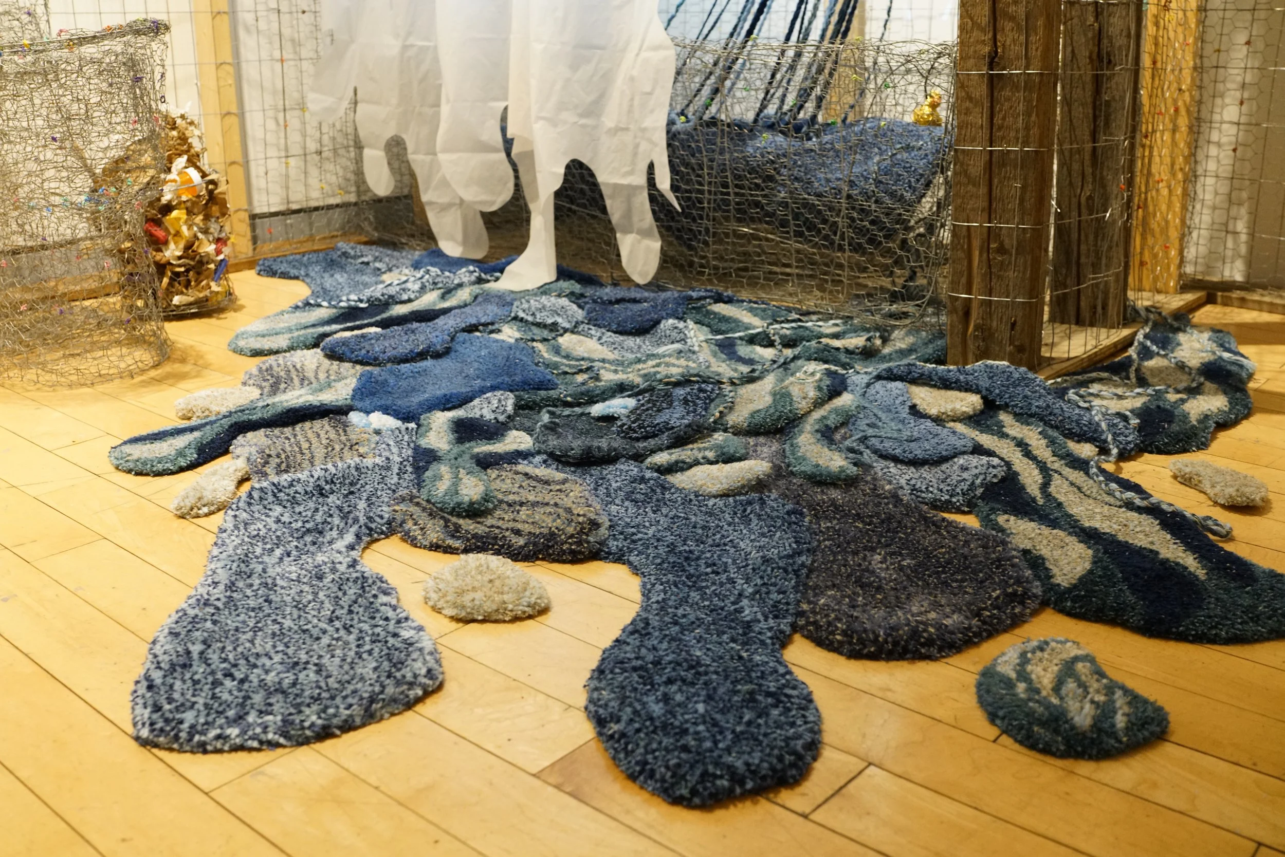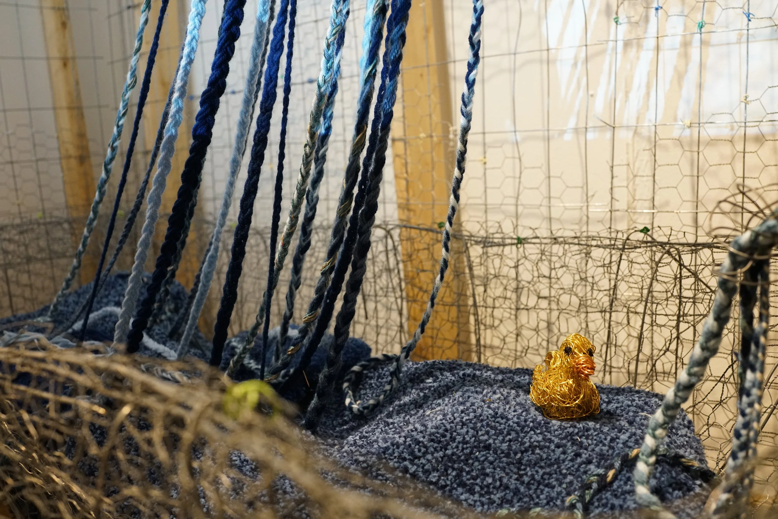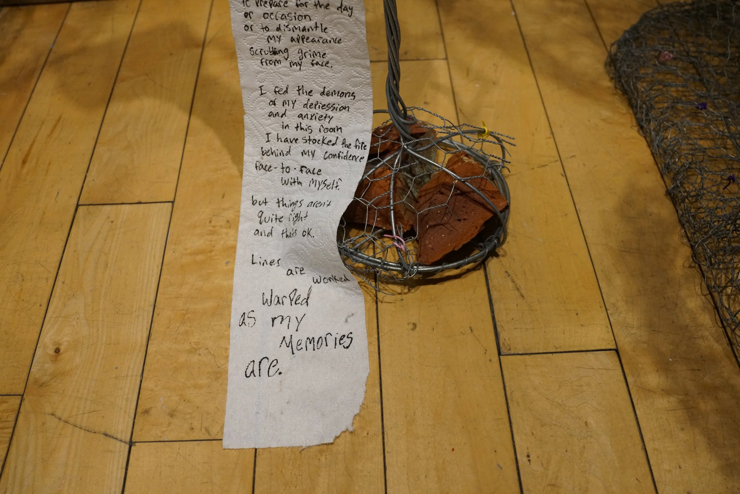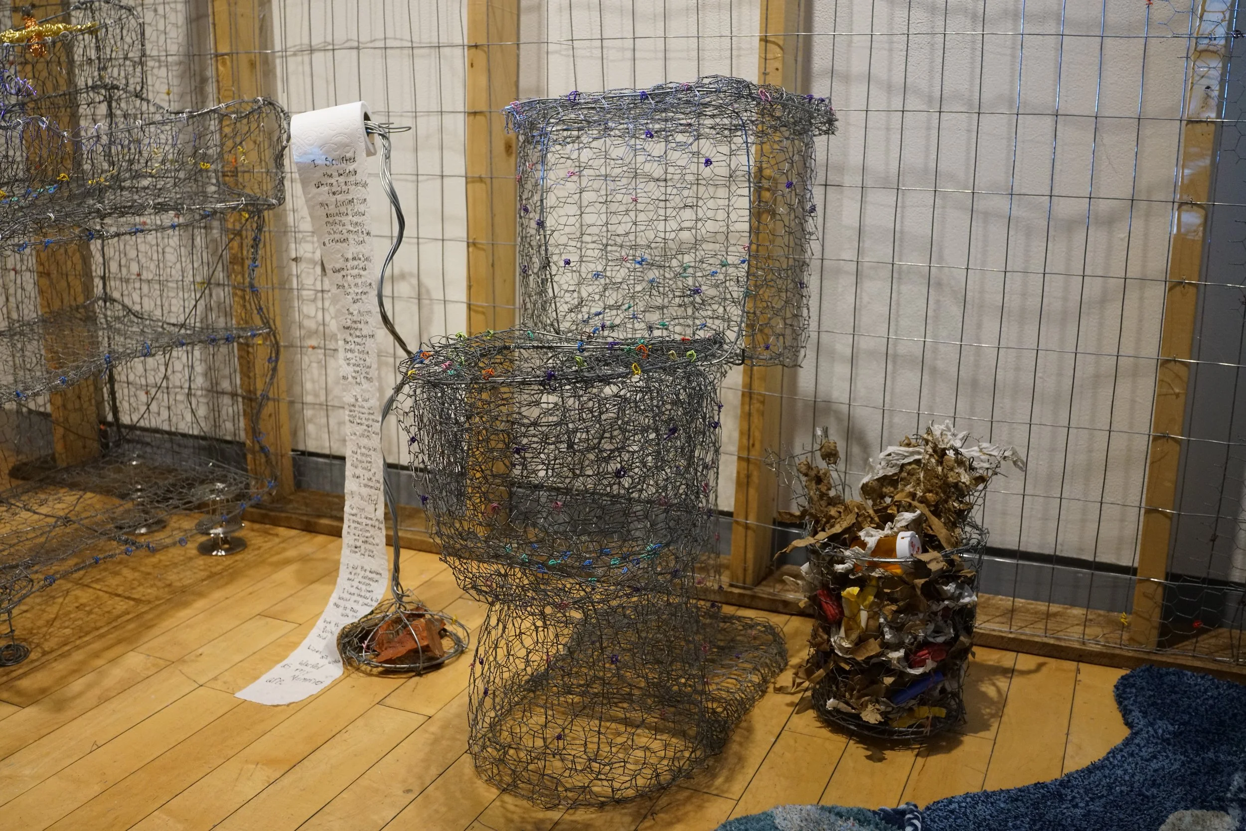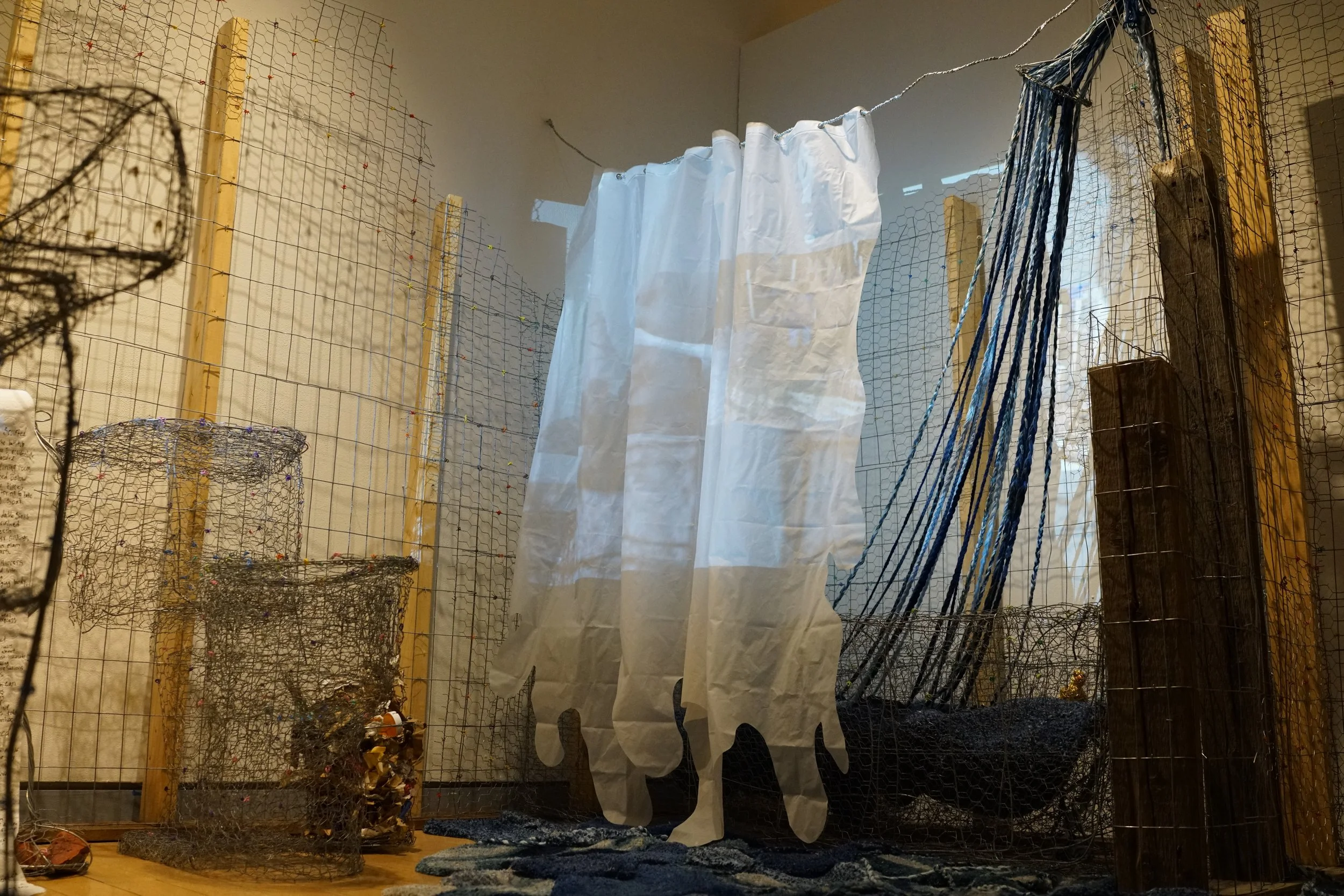 chicken wire, fence wire, aluminum wire, steel wire, fiber, film reels, ceramics, found objects, film projection