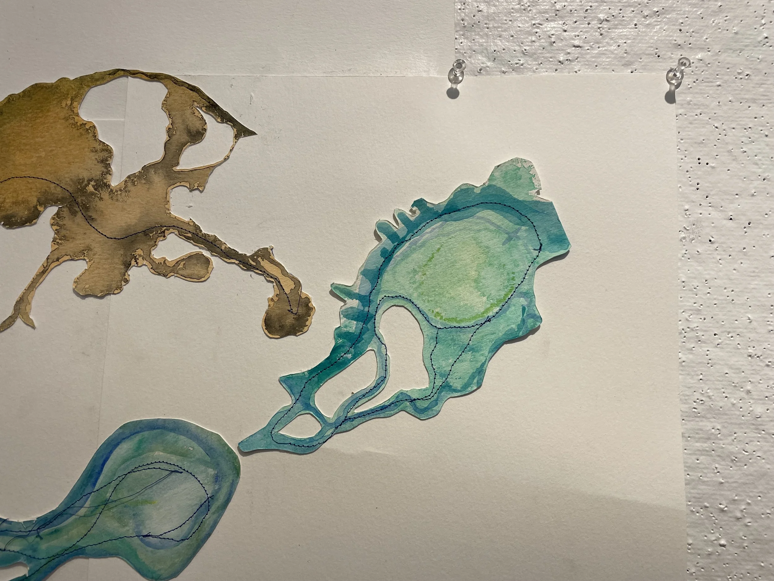 To create Liquid Embroidered Solid, I stepped inside the musical landscape of Andre 3000’s BuyPoloDisorder’s Daughter Wears a 3000™ Shirt Embroidered and the immobilized aquatic terrain of Arthur Dove’s painting, River Bottom: Silver, Ochre, Carmine, Green.